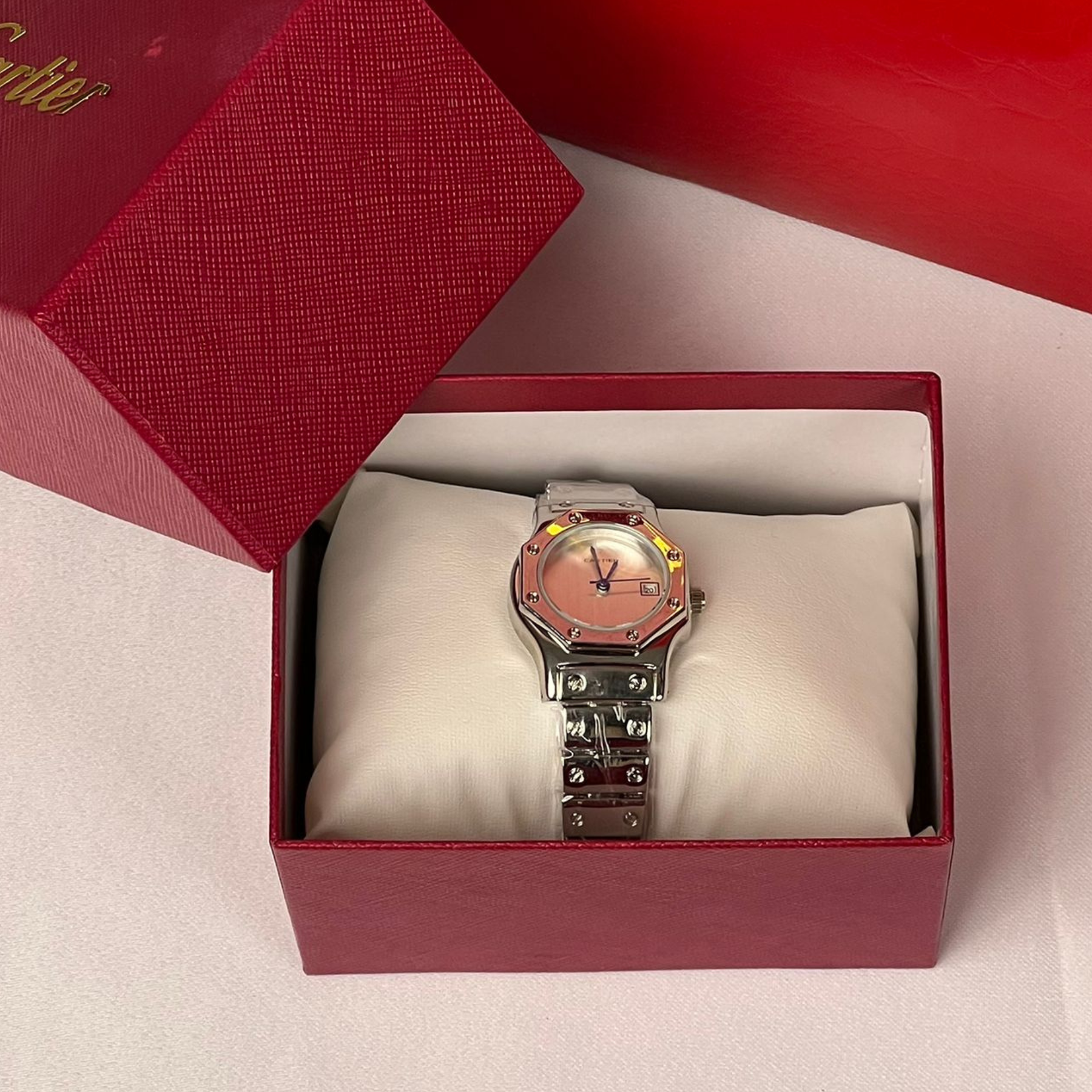 This all-silver Cartier watch stands out with its elegant and contemporary design. Its gleaming metallic bracelet highlights a soft pink round dial, giving it a sophisticated feminine look. It's the perfect addition for the woman seeking a touch of refinement and charm in her daily attire or for special occasions.
