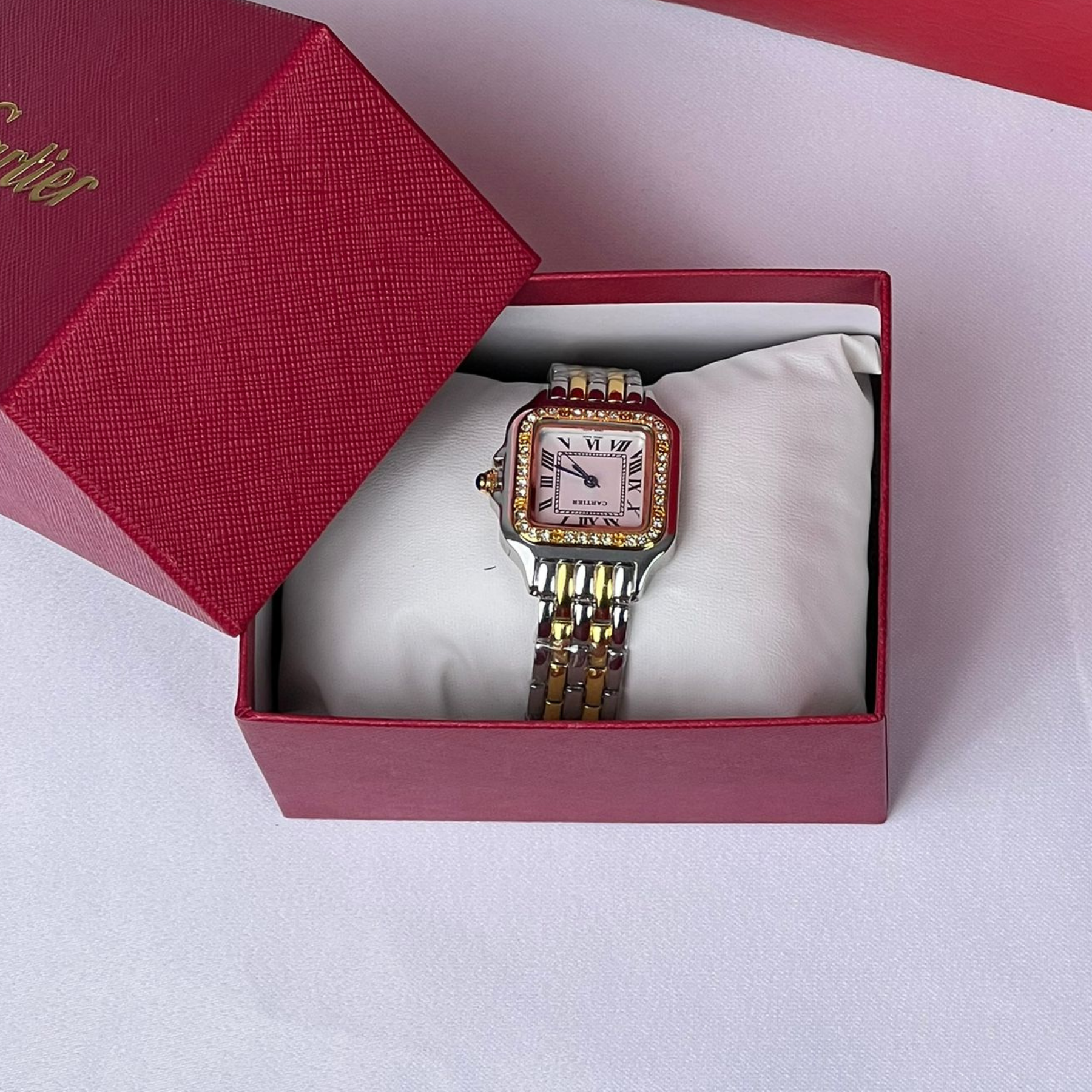 This Cartier "Panthère" watch embodies the pinnacle of feminine elegance and luxury. It features a sleek bracelet combining gold and silver, with a gold case highlighting a soft pink square dial and embellished details around the bezel, adding a touch of opulence and charm. It's the perfect choice for the woman seeking a piece that combines classic style with dazzling appeal.
