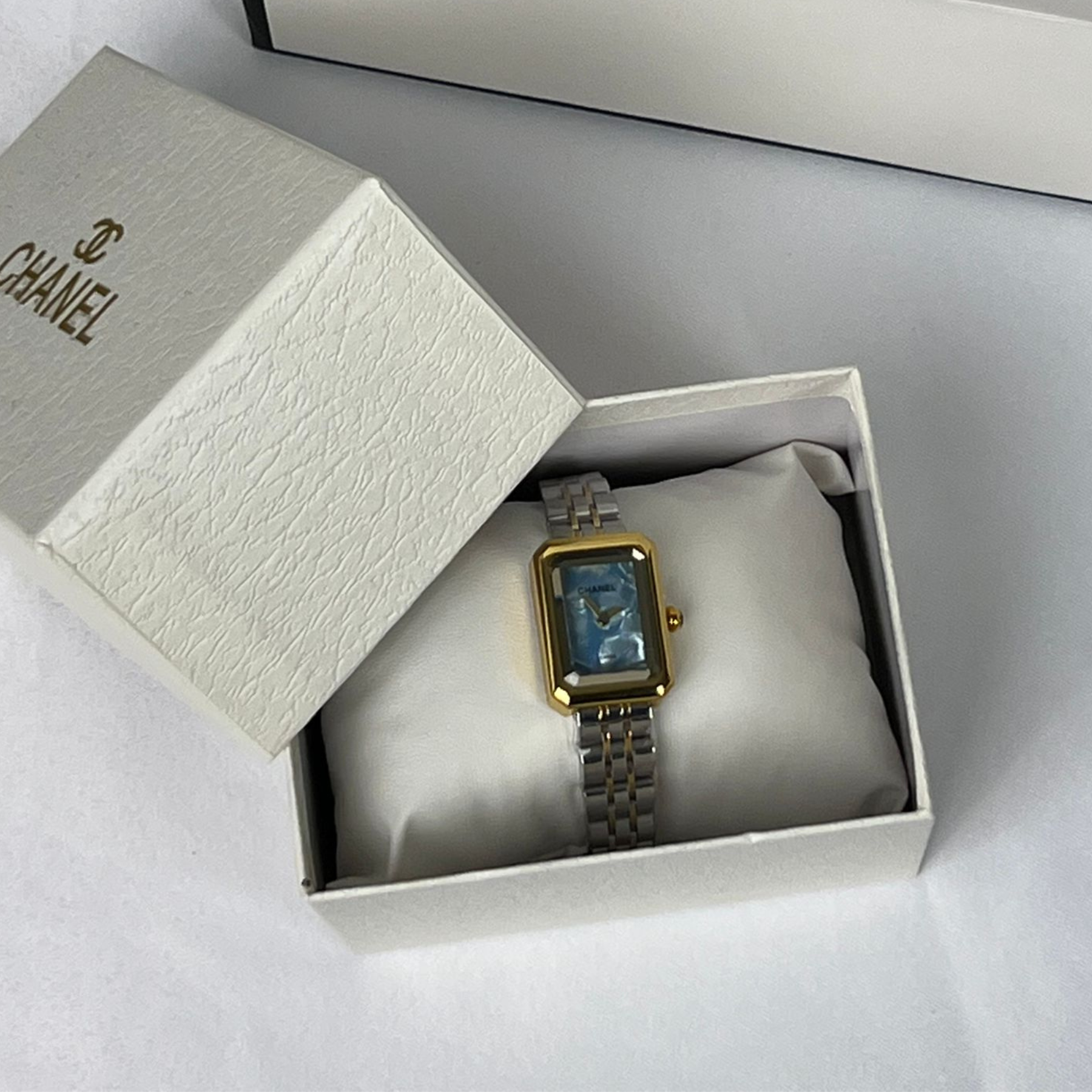 A unique piece of art, this Chanel watch blends classic elegance with contemporary design. It features a bracelet combining gold and silver, with a gold case highlighting a stunning rectangular dial with a marble pattern in shades of blue and green, giving it a sophisticated and distinctive look. It's the perfect addition for those seeking a luxurious piece that highlights style and individuality.