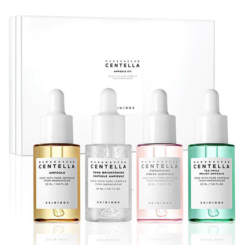 ערכת אמפולות Madagascar Centella של SKIN1004 כוללת ארבעה סוגי אמפולות לטיפוח עור מקיף: