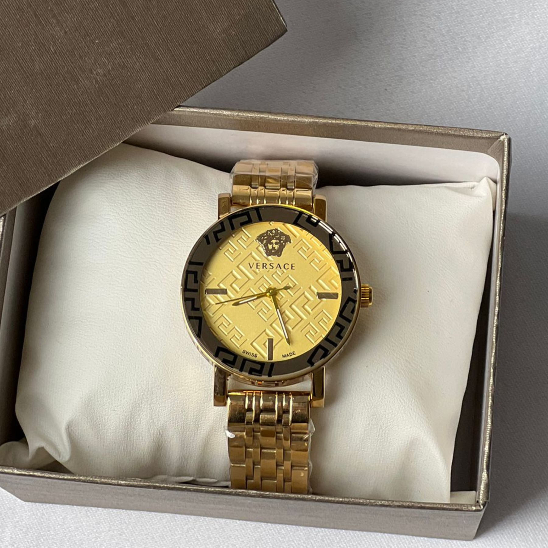 שעון ורסאצ'ה זהב מלא זה מגלם את פסגת היוקרה והנועזות. הוא מתאפיין ברצועת זהב מבריקה ובלוח זהב הנושא את מוטיב ראש המדוזה האייקוני, מה שמעניק לו מראה עוצמתי ומובחן המשקף את הזהות הייחודית של ורסאצ'ה. זוהי התוספת המושלמת למי שמחפש פריט יוקרתי המדגיש סגנון וייחודיות.